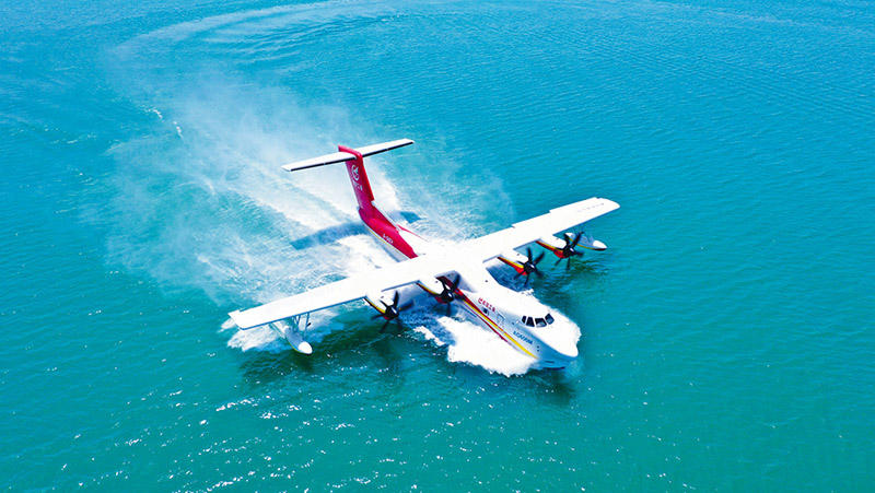 “十四五”期间,我国科技事业取得长足发展,形成一批重大原创性科技成果。2025年4月20日,我国自主研制的AG600“鲲龙”获得中国民航局颁发的型号合格证,标志着全球起飞重量最大的民用水陆两栖飞机通过了严格测试和验证,获得市场“准入证”。图为AG600飞机在湖北荆门开展水上科目试飞。新华社发中国航空工业集团供图