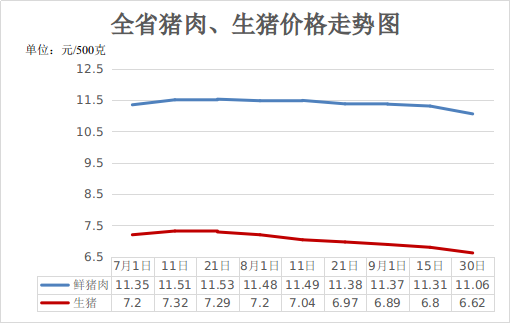 一、猪肉价格弱势下行。三季度猪肉价格走势主要是“供强需弱”的基本面导致,全国范围内生猪出栏量陆续恢复,市场供应整体较为充足。同时,养殖端为规避后期价格风险提前出栏,导致短期内市场供应增加。终端需求疲软,尽管9月开学前有集团采购备货,但整体需求表现不佳,下游市场需求清淡。同时,夏季高温天气也抑制了终端消费,批发市场白条肉走货速度缓慢。供大于求的局面使得屠宰企业为了控制成本,持续尝试性压价,带动生猪和猪肉价格双双下降。9月30日,生猪(每500克,下同)平均价格6.62元,比季度初(7月1日)下降8.06%,同比下降27.65%;猪肉(去骨后腿肉)11.06元,比季度初下降2.56%,同比下降22.77%。据国家对36个大中城市监测,猪肉(精瘦肉)平均价格15.57元,比季度初下降0.51%,同比下降13.88%。