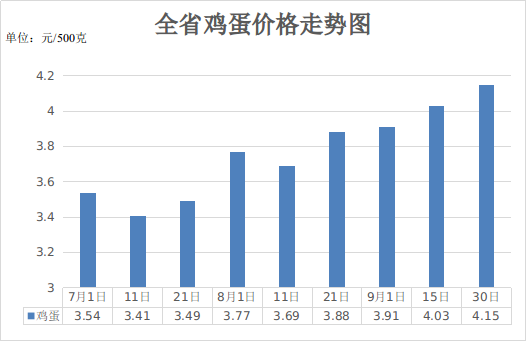二、鸡蛋价格波动上涨。7月鸡蛋市场供应充足,同时高温高湿天气导致鸡蛋储存难度增加,贸易商采购谨慎,市场走货缓慢,鸡蛋价格下降。8月市场供应持续充足,加之前期贸易商囤货的冷库鸡蛋在上旬集中上市,供应压力进一步加大,鸡蛋价格小幅下降;但随着贸易商开始为中秋备货,开学前集体采购恢复,鸡蛋价格又有小幅回升。9月食品厂为制作月饼备货及节前市场消费增加,鸡蛋价格又有小幅上涨。9月30日,鸡蛋平均价格4.15元,比季度初上涨17.23%,同比下降20.8%。据国家对36个大中城市监测,鸡蛋平均价格4.85元,比季度初上涨8.02%,同比下降17.09%。