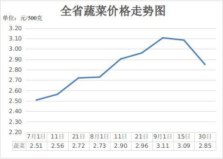 三、蔬菜价格季节性波动。7、8月价格上涨,9月价格下降。三季度正值北方夏秋蔬菜“换茬期”,部分品种的蔬菜处于生长过渡阶段,导致供应有所减少。加之7月辽宁进入主汛期,高温和频繁的降雨天气推高了蔬菜储运成本,高温天气也不利于叶菜类蔬菜的生长。9月天气转凉,利于本地蔬菜的生长和外地蔬菜的转运,凉爽的天气为蔬菜存储提供了极大便利,蔬菜市场价格小幅下降。9月30日,重点监测的16种蔬菜平均价格为2.85元,比季度初上涨13.66%,同比下降24.89%。据国家对36个大中城市监测,15种蔬菜平均价格为3.63元,比季度初上涨17.62%,同比下降16.87%。