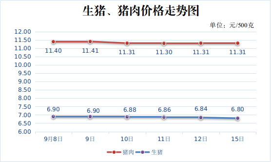 一、猪肉价格下降。养殖端出栏相对积极,生猪市场供应持续增加;需求端,目前虽进入传统消费旺季,但总体消费不及预期,猪肉价格偏弱运行。9月15日,生猪(每500克,下同)平均价格6.80元,周环比下降1.45%,同比下降30.33%;猪肉(去骨后腿肉)11.31元,周环比下降0.79%,同比下降24.04%。