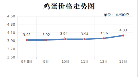 二、鸡蛋价格上涨。受季节性备货增加因素影响,鸡蛋价格继续小幅上涨,但受蛋鸡高产能限制,整体反弹空间有限。9月15日,鸡蛋平均价格4.03元,周环比上涨2.81%,同比下降29.91%。