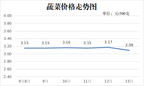 三、蔬菜价格下降。随着降雨的明显减少和高湿高温天气的逐渐减退,蔬菜市场供应的稳定性明显恢复,蔬菜的整体价格基本平稳。9月15日,重点监测的16种蔬菜平均价格为3.09元,周环比下降1.90%,同比下降18.04%。