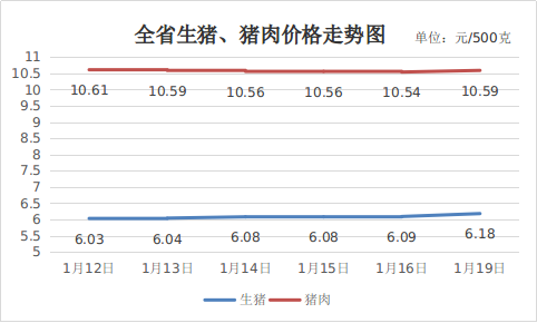 一、猪肉价格微幅下降。供应端:由于对于春节前中大猪仍有看涨心态,养殖户压栏惜售,规模企业出栏节奏放缓,阶段性供应偏紧,带动生猪价格微涨。需求端:春节终端备货需求尚未开启,家庭以消化存量为主,终端需求减弱,猪肉价格微幅下降。1月19日,生猪(每500克,下同)平均价格6.18元,周环比上涨2.49%,同比下降22.85%;猪肉(去骨后腿肉)10.59元,周环比下降0.19%,同比下降16.35%。
