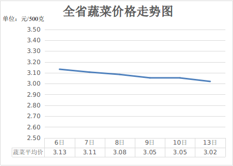 三、蔬菜价格小幅下降。前期气温回升促使省内蔬菜整体采摘量明显增大,加之南方及山东等地冷棚与温室蔬菜同步集中上市,多产区货源叠加导致市场供应极为宽松,蔬菜价格稳步下行。4月13日,重点监测的16种蔬菜平均价格为3.02元,周环比下降3.59%,同比上涨0.58%。