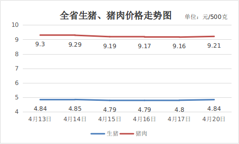 一、猪肉价格降幅收窄。供应方面,随着猪价持续下降,部分养殖户提前出栏止损,生猪供应阶段性增加;需求方面,清明节后市场进入传统淡季,但随着气温回升,居民外出活动增加,以及商家为即将到来的我省中小学生春假和“五一”假期备货,带动生猪、猪肉价格降幅较上周分别收窄3.59和1.55个百分点。4月20日,生猪(每500克,下同)平均价格4.84元,周环比持平,同比下降35.21%;猪肉(去骨后腿肉)9.21元,周环比下降0.97%,同比下降21.42%。